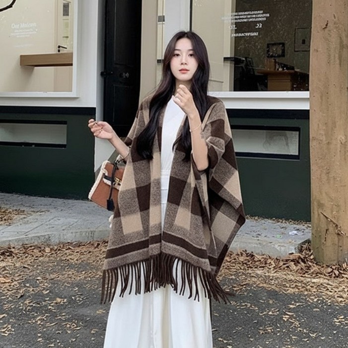 FOSSETTE포셋 헤이든 체크 어깨숄 빅사이즈 롱 판초 머플러 망토 케이프 워머