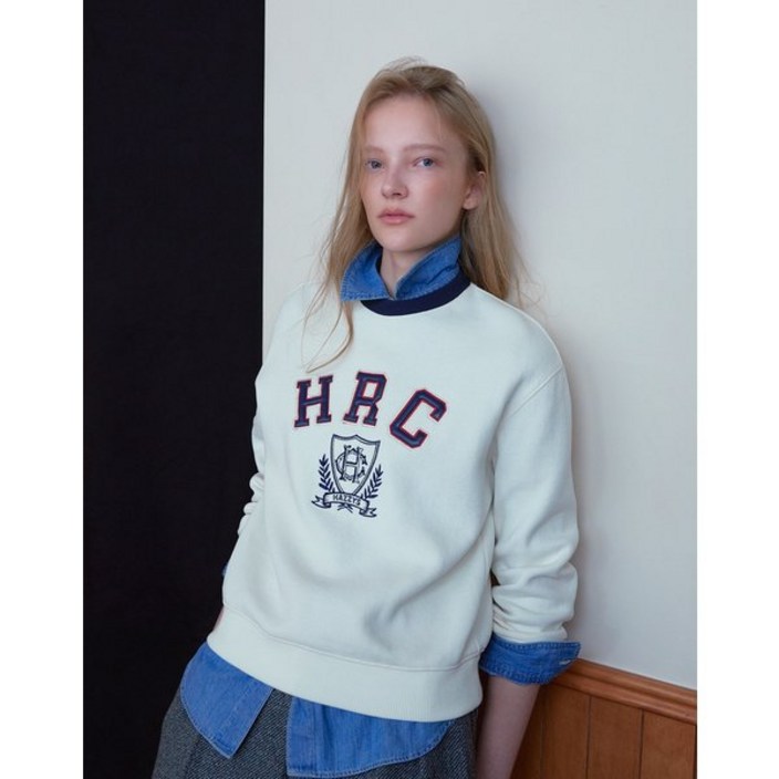 헤지스레이디스 24FW 가격인하면100 아이보리 로잉 그래픽 맨투맨 티셔츠 HSTS4D904IV 가을 편한 이너