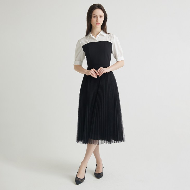 나이스클랍 여성용 텍스처 블록 셔츠 플리츠 원피스 N242MWO314BK