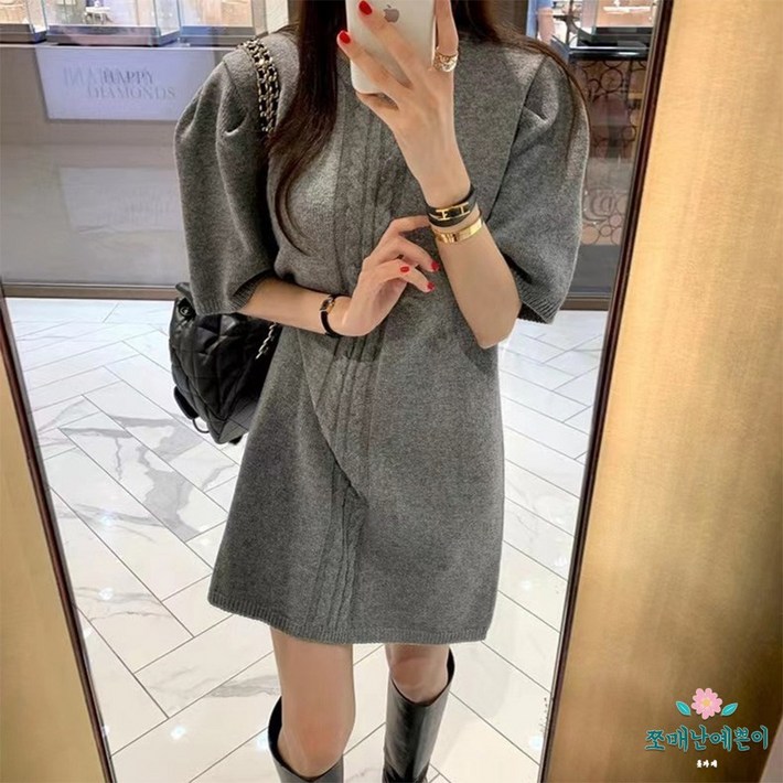 쪼예 라운드넥 꽈배기 퍼프 루즈핏 반팔 니트 미니 원피스